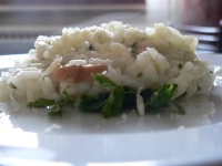 Mettere a scaldare il brodo. Lavare una grossa zucchina e grattugiarla grossolanamente. Rosolare in poco olio uno spicchio d’aglio, aggiungere il riso e mescolare. Versare mezzo bicchiere di vino bianco e lasciare evaporare. Far tostare qualche minuto, poi aggiungere la zucchina grattugiata. Sempre mescolando unire ogni tanto un mestolo di brodo bollente e portare il riso alla cottura, prima di fine cottura unire la scamorza bianca a dadini e la scamorza affumicata a pezzetti più grossi. Servire quando tutto è ben amalgamato, con una spolverata di parmigiano. (ricordati di togliere lo spicchio d'aglio)